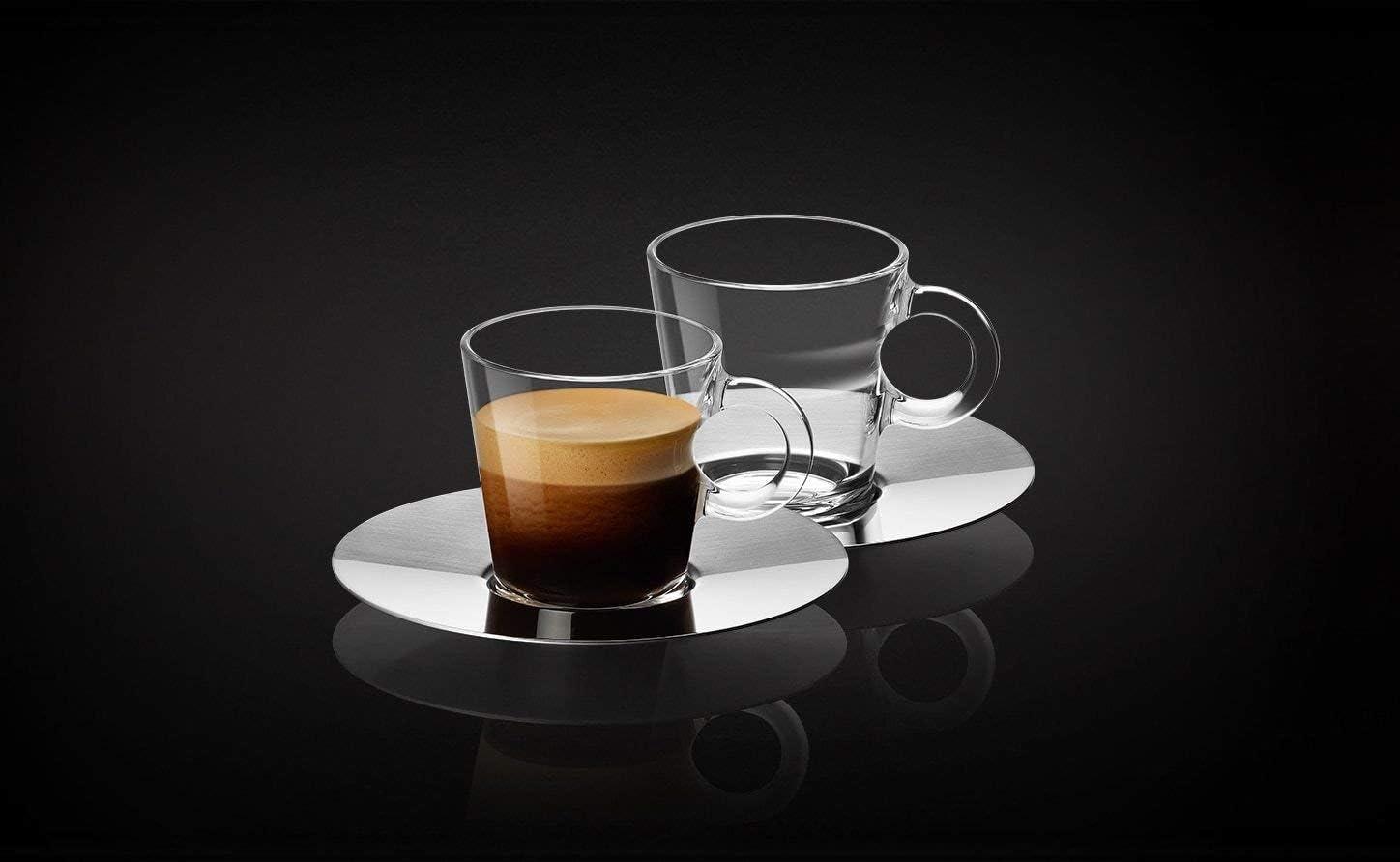 Set of 2 Espresso cups (2.7 oz.) in tempered glass and 2 saucers in stainless steel (18/10) with a shiny and brushed finish.